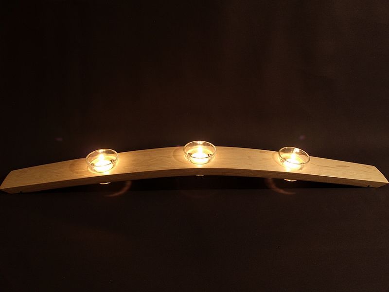 Hancrafted in Saint Emilion from dismantled wine barrels, this tealight holder is simple but stylish. The recycled stave was softly varnished to highlight its natural beauty and character. As the barrels held red wine, the stave holds a dark red stain on the back. The natural arch from the stave sets the stage for elegant illumination. Holds 3 floating candles. Includes 3 glass votive holders, does not include candles. Measures approximately 95cm.